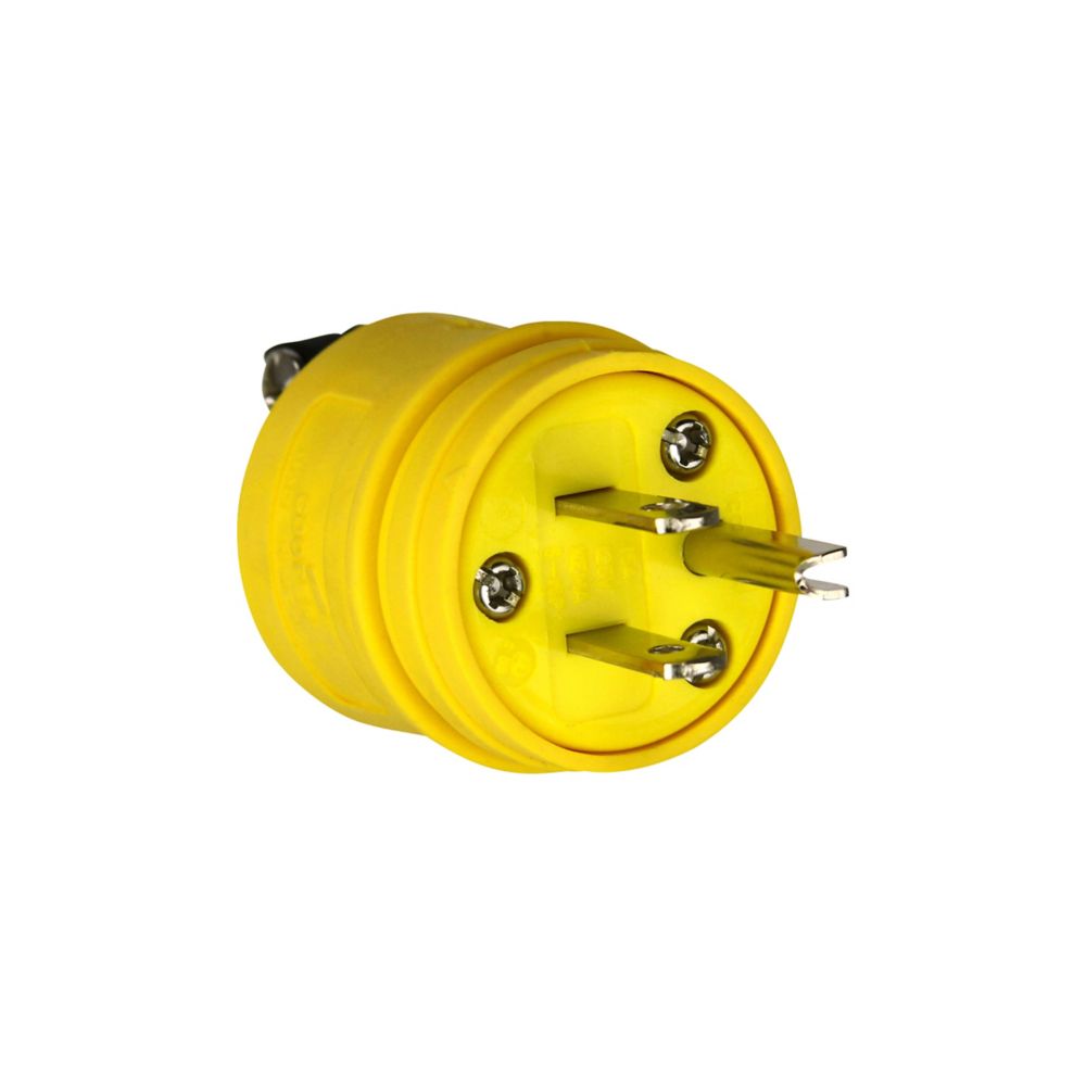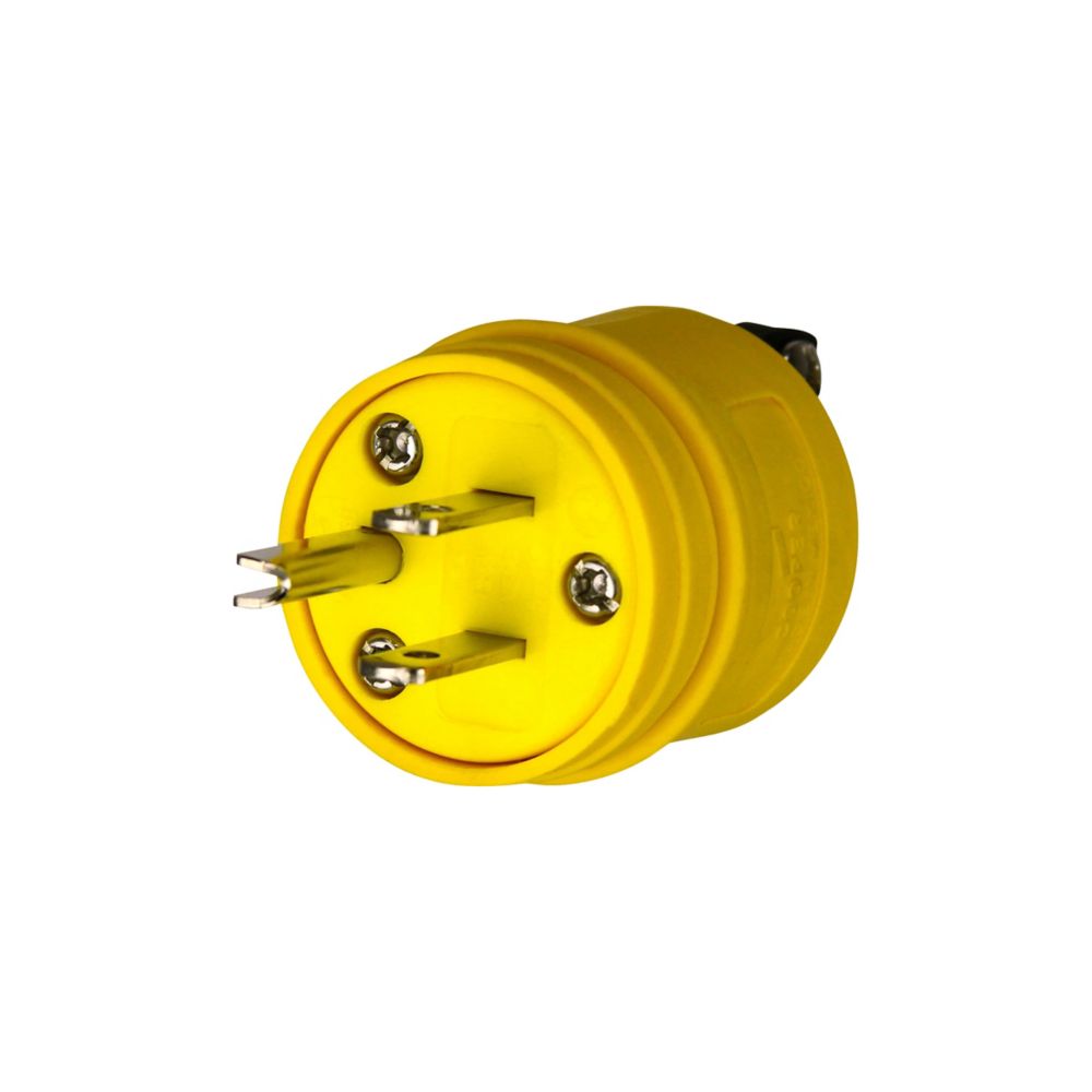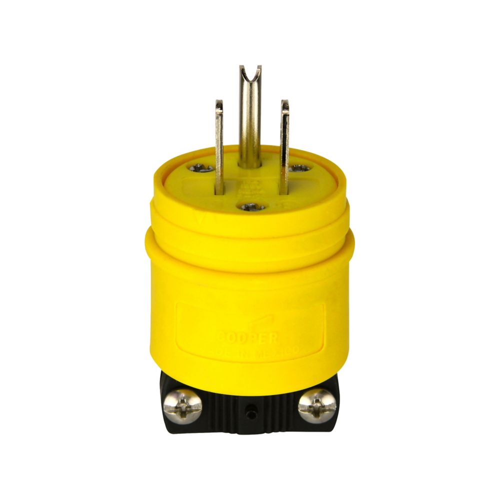 Long Description | Straight Blade Plug, 15 A, 125 V, 2 Poles, 3 Wires, Yellow/Black, Rubber Material, 3.25 in; 0.38 to 1.00 in (Cord) Diameter, 0 to #14 AWG Wire Size, 0.2 lb |