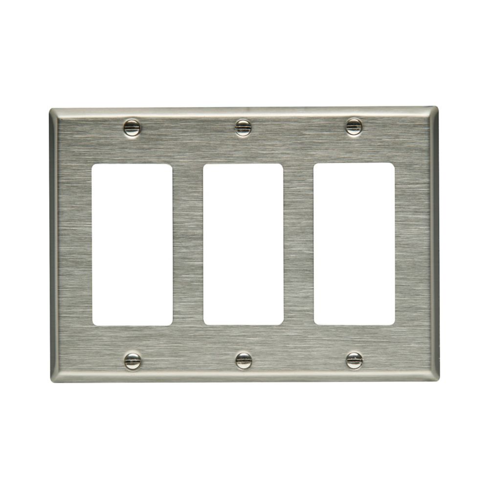 Long Description | Eaton Decorator / GFCI wallplate, Stainless steel, Decorator Cutout, Stainless steel, Three-gang, Standard, ED Box |