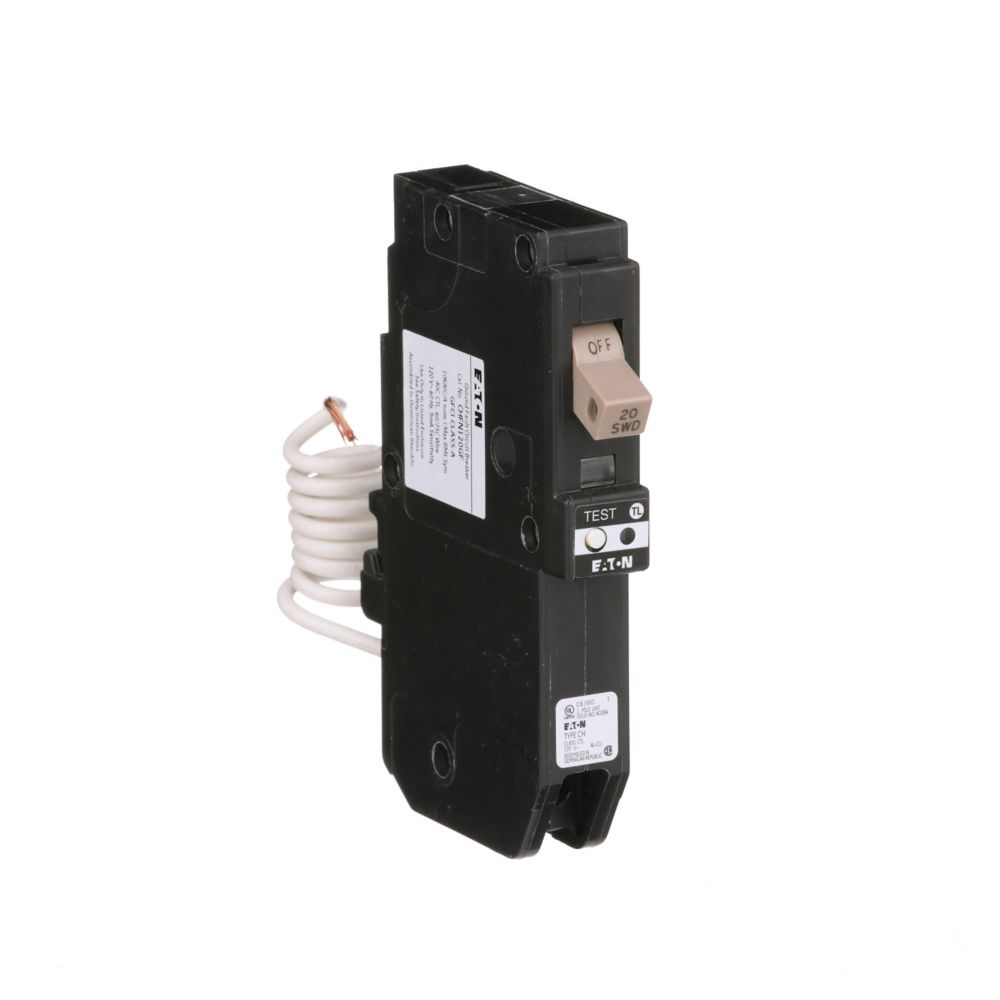 Description: Eaton CH GFCI Breaker, 20A, Pigtail connection, 10kAIC interrupt rating. Provides premium overload and ground fault protection with visual trip indicators and nuisance trip prevention.