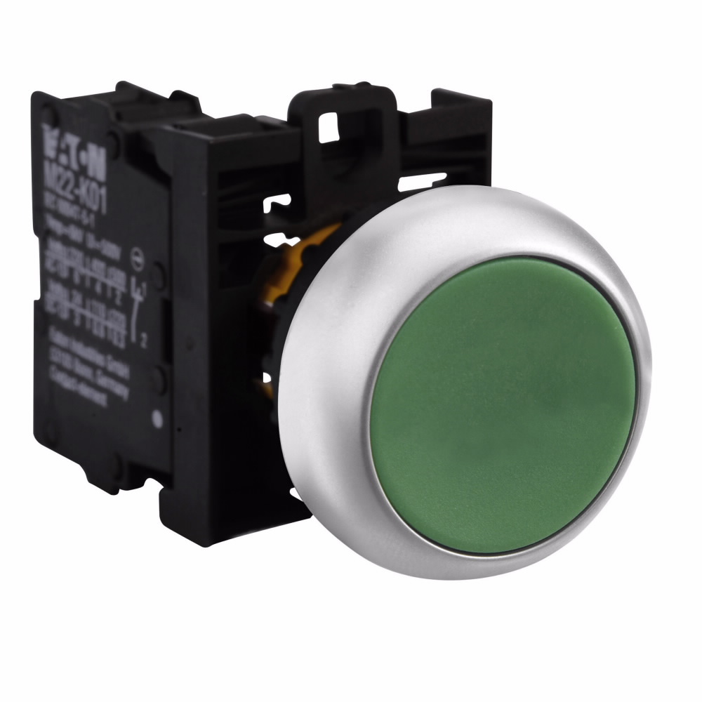 Eaton 22.5 mm RMQ-Titan Pushbutton, Etching: NO, Early Make, Green Actuator, Silver Bezel, 1NO – 1NC, IP67, IP69K, Non-Illuminated, Flush Mounting, NEMA 4X, NEMA 13, 5,000,000 Operations, Momentary, Modular Design |