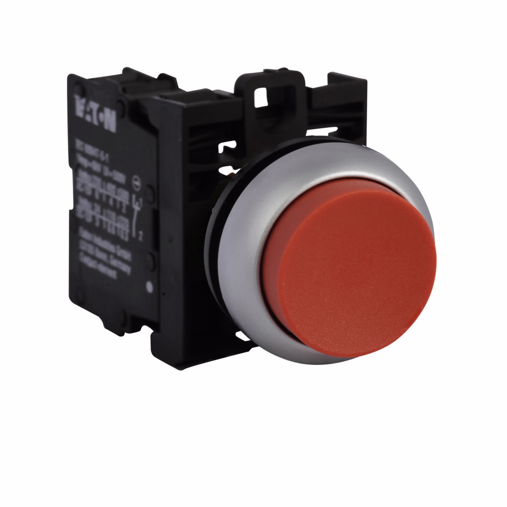 Eaton M22 Modular Pushbutton, Complete Device, 22.5 mm, Extended, Momentary, Non-Illuminated, Silver Bezel, Red Button, 1NO – 1NC, IP67, IP69K, NEMA 4X |